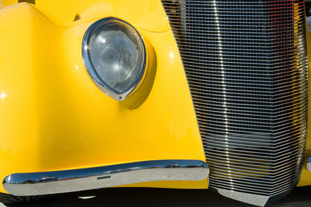 Detail of the back of a vintage yellow car in Portobello Road. London (UK), July 2017. Landscape format.