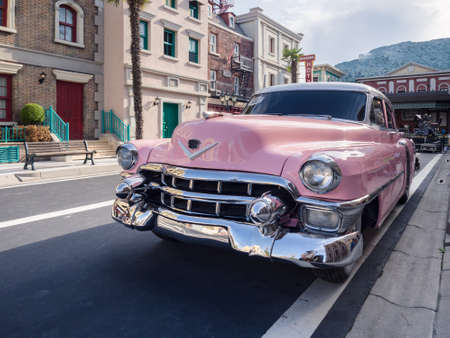 Verona, Italy - September 7, 2019: Vintage pink car parked along a street.