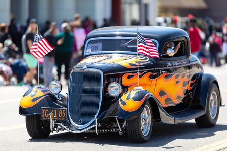 Benton Harbor, Michigan, USA - May 4, 2019: Blossomtime Festival Grand Floral Parade, Hot road carrying the american flag, going down the road during the parade
