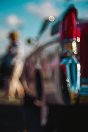 Colorful abstract background retro car. Boke background with copy space. Close-up view vintage American auto details with bubble bokeh effect.