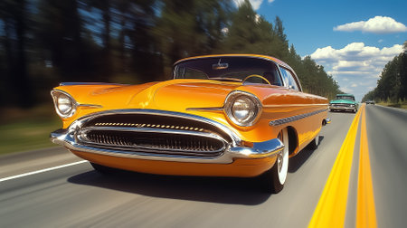 Classic orange car speeds along scenic highway with bright blue sky and fluffy white clouds. Lush green trees line the road. Concept of automotive culture, vintage travel, road trips.