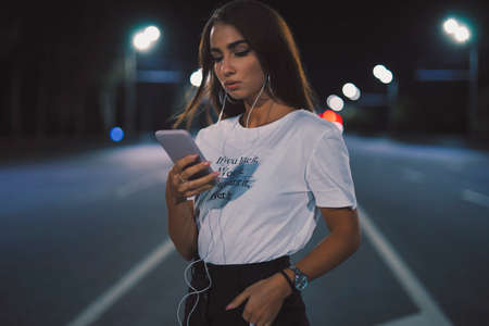 Portrait woman in earbuds at night road listening to music in earphones standing enjoying playlist songs on mobile