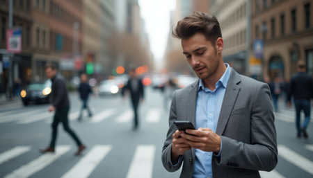 A stylishly dressed man in a gray suit stands on a bustling city street, focused on his smartphone. The urban backdrop features blurred pedestrians and traffic, capturing the fast-paced rhythm of city life.