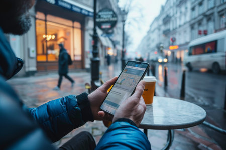 Man sitting at cafe table reading online news on smartphone in the morning while drinking coffee