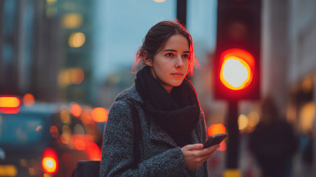 Young woman scrolling through her phone while waiting at a red light, casual urban background