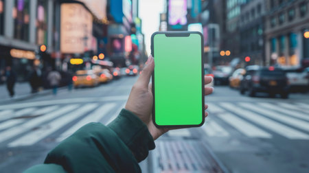 Mockup image of a hand holding a mobile phone with blank black screen in the street