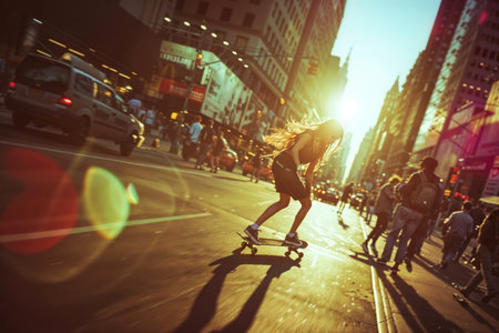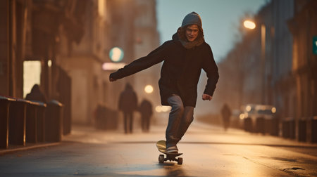 Young skateboarder glides through a vibrant urban street at dusk capturing the thrill of skating