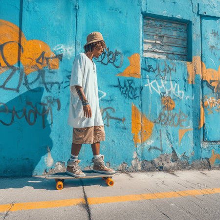 Young man in casual streetwear and bucket hat cruising on a longboard beside a bright blue wall covered in graffiti art on a sunny urban street.