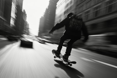 Artistic motion blur shot of a skateboarder gliding through an urban landscape, capturing the dynamic motion and street culture. Generative AI