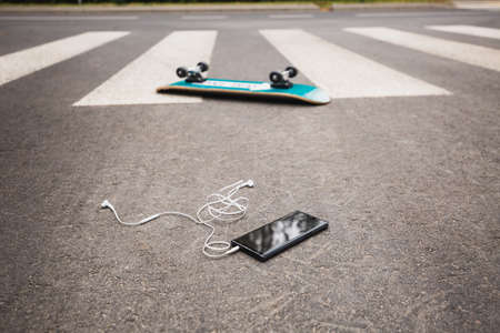 Skateboarder riding on the road in the forest. Outdoor lifestyle
