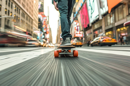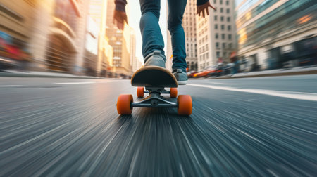 Low-angle view of a skateboarder cruising down a city street, capturing the essence of urban adventure and motion.