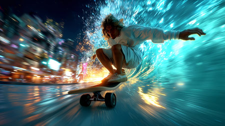 A dynamic digital artwork of a skateboarder speeding through a surreal urban landscape. The wave-like background blends city lights with fluid motion, while sparks and glowing trails follow the board, creating a high-energy fusion of skateboarding and cosmic surfing. A vibrant celebration of movement and freedom.