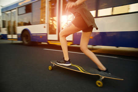 Girl legs rolling a longboard on the city road in the sunlight with urban life in background. Cropped image of hipster with tattoos skateboarding in the city.