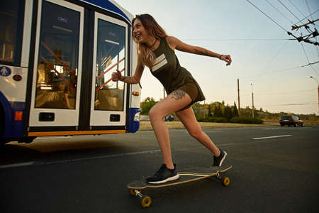 Cheerful young girl with tattoos riding on longboard on the road in the city in sunny weather. Extreme sports. Lifestyle, hobby, freedom, self expression
