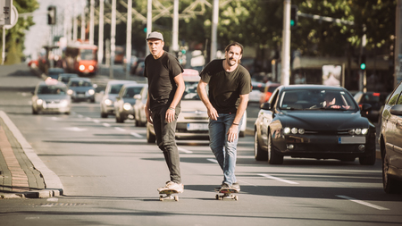 Teenagers dressed in the coolest clothes skateboard on the street.