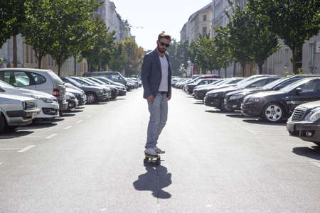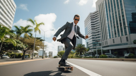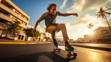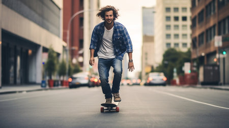 A happy and sporty man rides his longboard with a wide smile on his face, effortlessly gliding through the streets, embracing the thrill and freedom of the ride. AI Generative AI