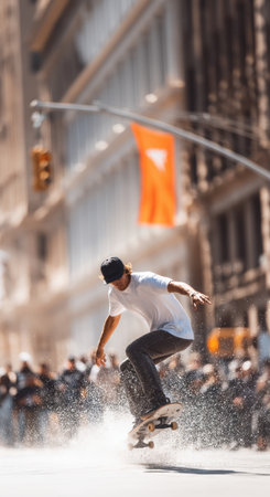 Skateboarder performing an ollie in a bustling city setting with motion blur effect