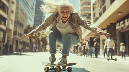 An elderly woman skateboarding down a city street, radiating joy and freedom. She is enjoying life to the fullest.