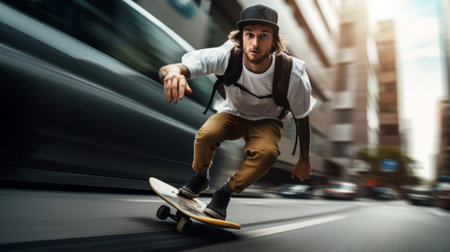 A skateboarder is executing a trick in the middle of a city street, showing off their skills and agility. Generative AI