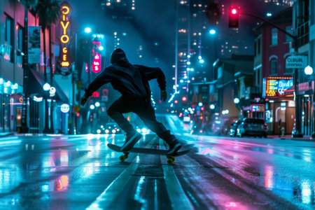 A skateboarder in a black hoodie gracefully navigates slick, reflective city streets illuminated by colorful neon lights, showcasing urban nightlife as rain adds a moody ambiance.