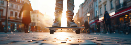 A young skateboarder is showcasing impressive tricks on a skateboard in a bustling urban environment. The sun is setting, casting warm light on the scene as people and cars pass by.