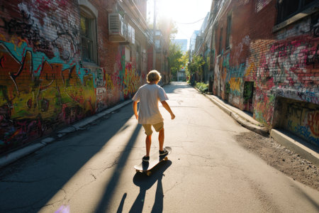 Teenage skateboarder rides through a colorful graffiti-covered alley on a sunny day, capturing a dynamic urban vibe with expressive street art and summer light