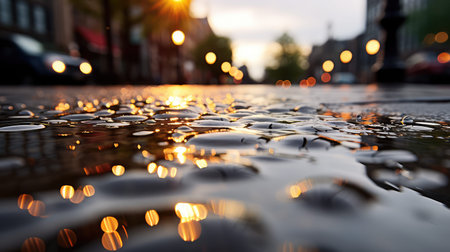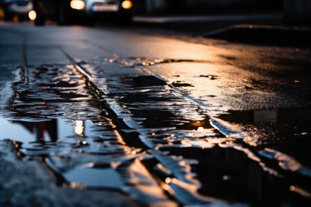 A close-up captures a wet asphalt surface reflecting a vibrant golden glow. Ripples disturb the water, creating textured patterns. The scene is bathed in a cool, dark ambience with strong color contrast. Suitable for use in commercial projects, the image provides a unique visual element.