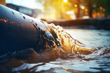 Sunlight illuminates water splashing in a pipe, showing the beauty of water movement on a warm day.