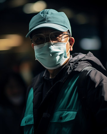 fashionable handsome man with a black cap in a stylish jacket and hoodie wears a protective medical mask near a white wall. Male urban style and pandemic concept