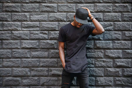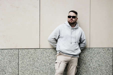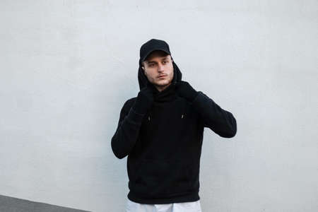 Cool young handsome hipster guy in a stylish black cap with a fashionable black hoodie stands near a white wall on the street