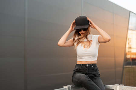 Young beautiful woman model in fashion sunglasses in fashionable clothes in sneakers and cool baseball cap sit on metal railing on dark background at sunset. Youth casual summer look