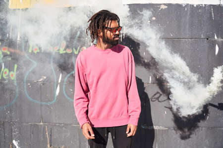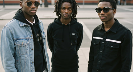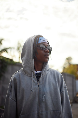 Black young adult man wearing hoodie and sunglasses standing outdoors looking away from camera, braided hair visible under bandana, casual urban style, confident posture