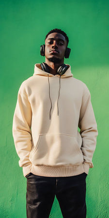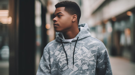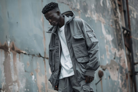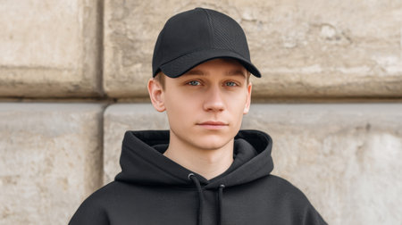 A young man poses confidently in a casual black hoodie and cap against a textured wall, reflecting modern urban fashion and youthful spirit in a chic setting.