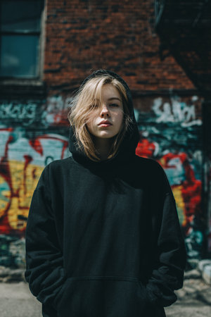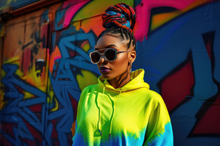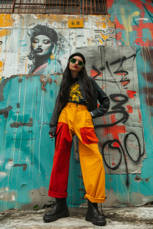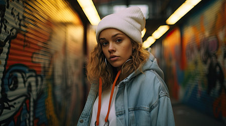 Stylish Young Woman Posing in Front of Urban Graffiti Artwork on Weathered Wall Wearing Trendy Fashionable Outfit with Sunglasses AI Generative