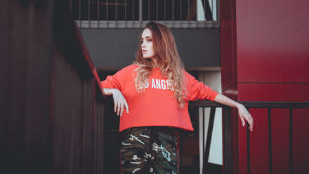 Fashion model wearing red hoodie with the inscription los angeles posing in the city at parking. Fashion urban outfit. Casual everyday clothing style