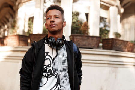 Male portrait of a handsome guy in headset, poses outside with attitudine, isolated on a buildings background.