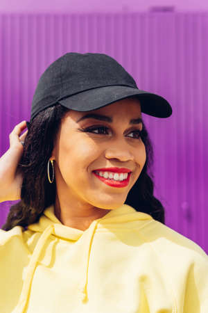 Portrait of the face of a smiling young African woman, in a yellow cap and sweatshirt on a purple background.Young girl with reggaeton and hip hop style urban clothes.