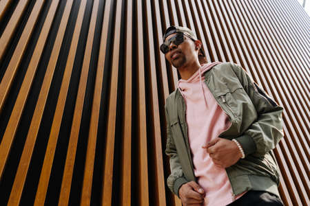 Fashion man in urban wear. Street outfit portrait in lifestyle clothing. Brutal fashionable young man. Cool trendy modern clothes. Casual adult person