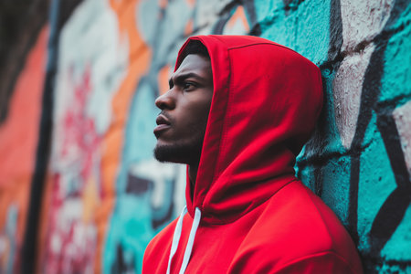 Urban portrait of a young man in a red hoodie against a vibrant graffiti wall