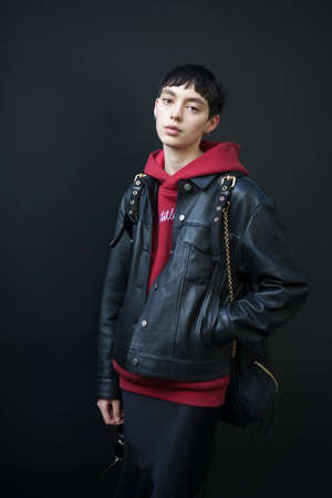 Fashionable hipster man with hairstyle in stylish black jacket stands near a black wall indoors