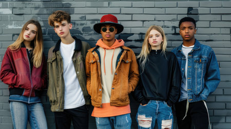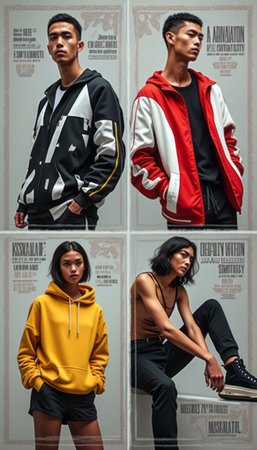 Four fashionable individuals, each wearing unique streetwear outfits, exude confidence and modern style against a textured backdrop. The vibrant colors and bold designs reflect the essence of urban fashion, appealing to trendsetters and style enthusiasts alike.