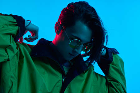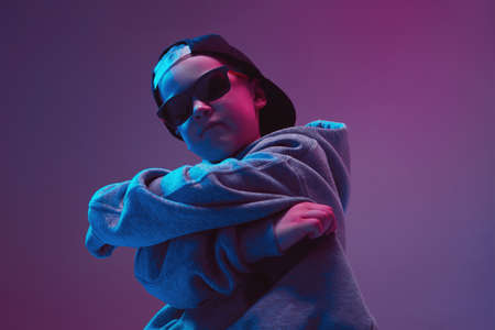 Portrait of a cool boy child in a rap image, stylishly posing in a hoodie, sunglasses and a cap on a neon background.
