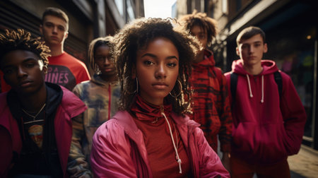 A diverse group of teenagers from different backgrounds, participating in a community project, fashionably dressed for trends. Inclusion and Diversity.