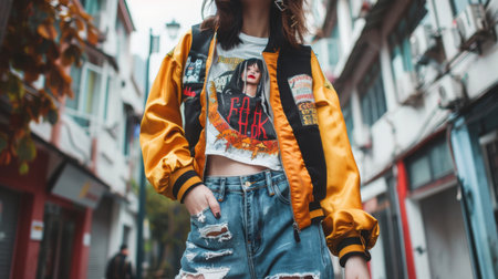 Urban Fashion Display Featuring Young Woman in Colorful Bomber Jacket and Distressed Denim