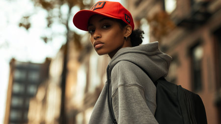 Young woman in a gray hoodie and red cap walking on a city street during autumn