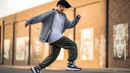 A stylish young man freezes in mid-air while performing a dance move on an urban street. Dressed in a grey hoodie, cargo pants, and a beanie, he embodies youth culture, energy, and street fashion against a blurred brick wall background.