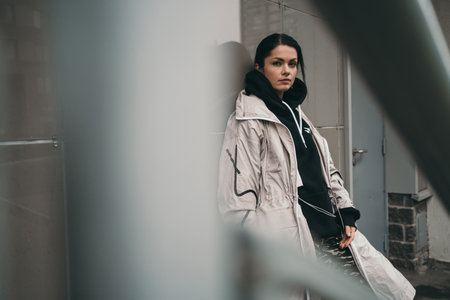 Young woman in stylish outerwear and scarf poses confidently in urban setting on sunny day