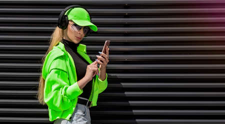 Sporty girl shooting selfie. Beautiful woman in trendy sportswear using smartphone and earphones on black wall.