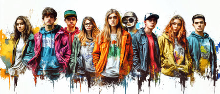 A vibrant group of European youth embraces urban vibes, dressed in trendy clothes surrounded by colorful graffiti, radiating youthful energy.