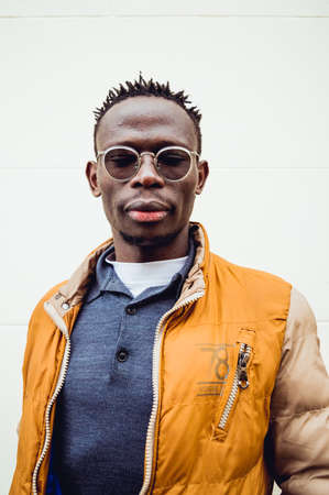 vertical and front view portrait of african man with glasses, calm outdoors on a white wall, looking at the camera, concept of social networks and lifestyle.